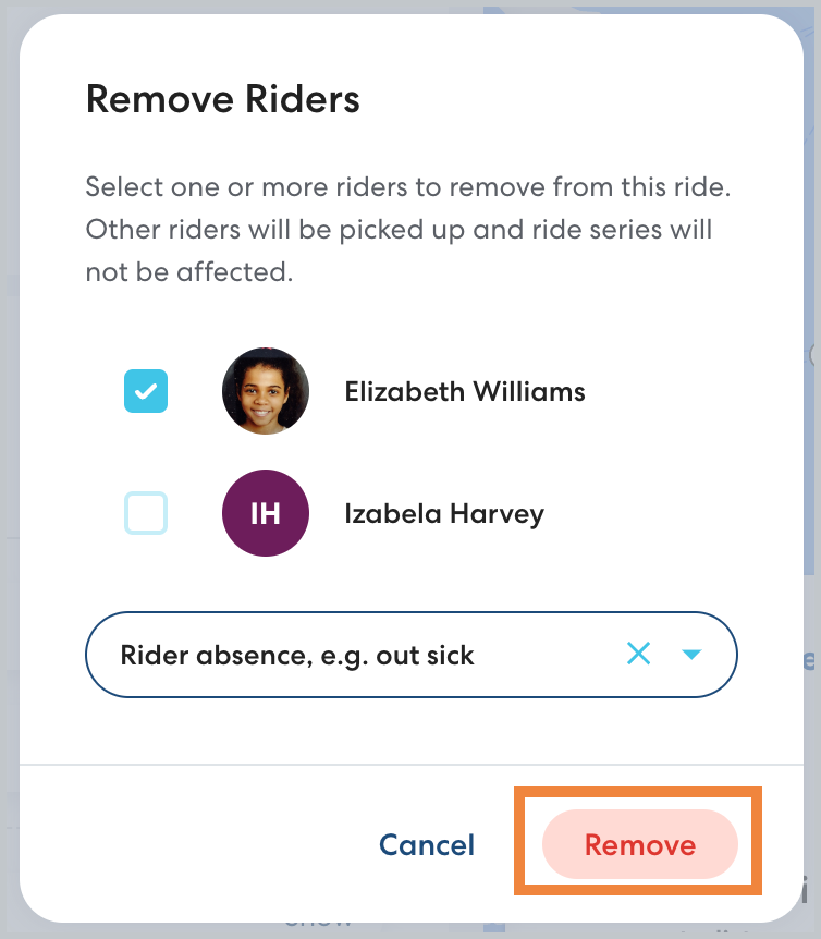 Sometimes circumstances change and a rider no longer needs a scheduled ride. When there are multiple riders on the ride, you can remove the rider while keeping the ride as scheduled for the other riders. You can remove a rider from a single ride in a series or remove them from all rides going forward.