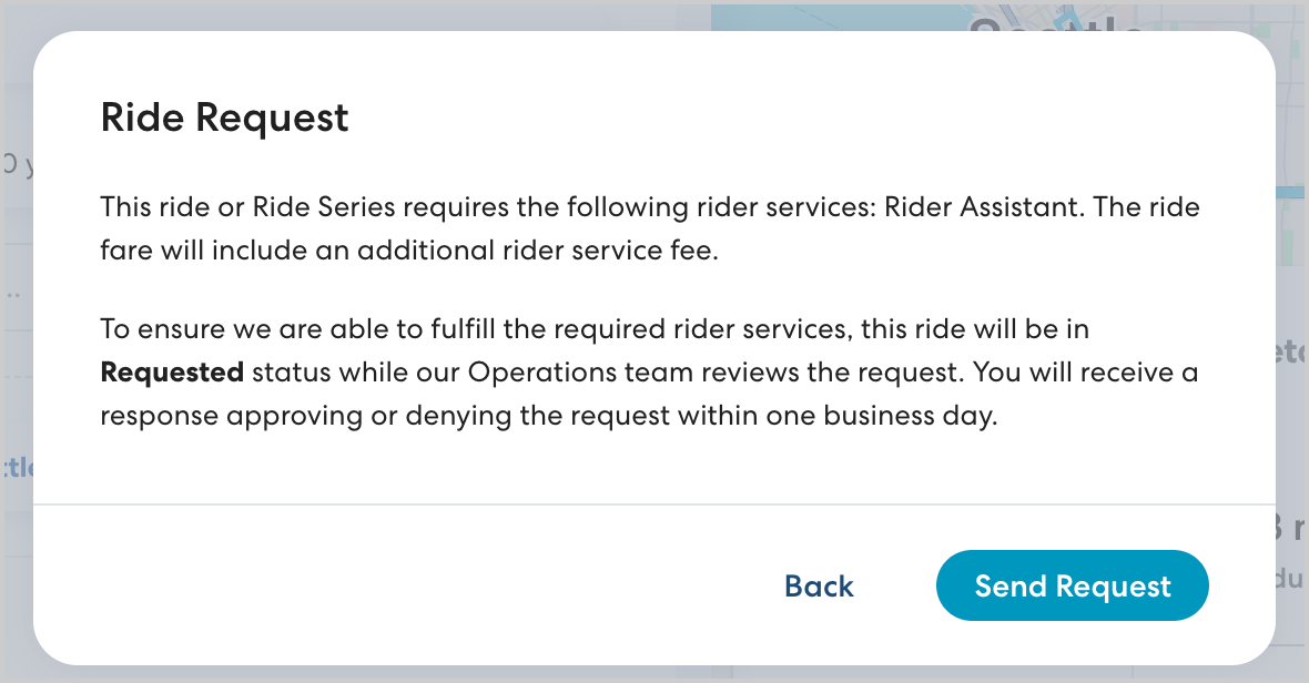 After adding the service to a rider's profile, schedule a ride or Ride Series as usual. When you save the ride, you'll see a message informing you that you are submitting a ride request.