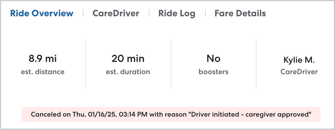 | CarePartner canceled | The ride was part of a series that was canceled by the CarePartner transportation provider. |