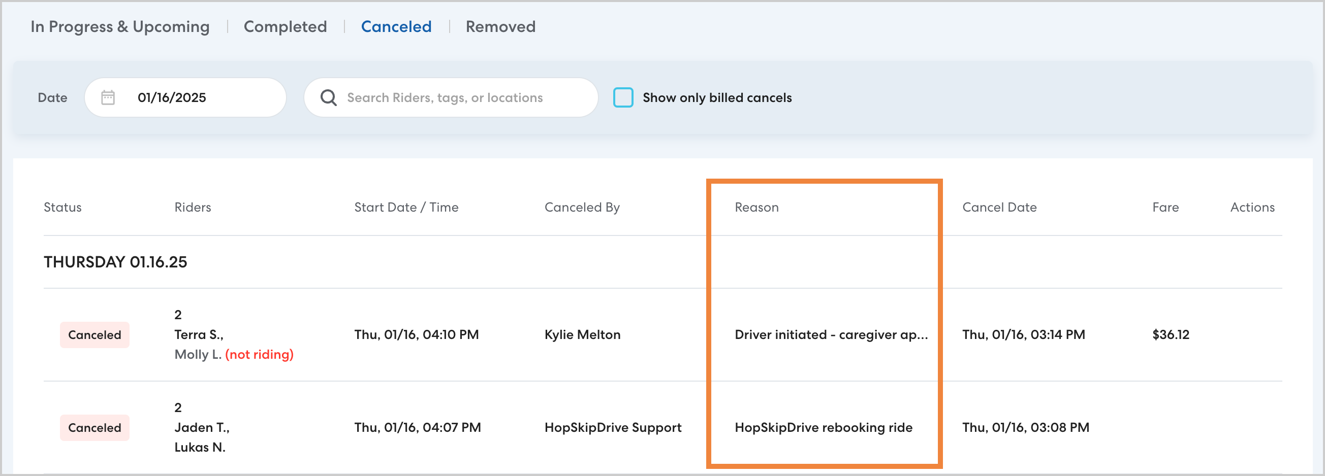 In RideIQ and in the supporting documentation for your HopSkipDrive invoices, you'll see a Cancellation Reason listed for each canceled ride. Most cancellation reasons are selected by the person canceling the ride, either a Ride Organizer or HopSkipDrive Support. Some cancellations are generated automatically by the system or initiated by CareDrivers or caregivers.