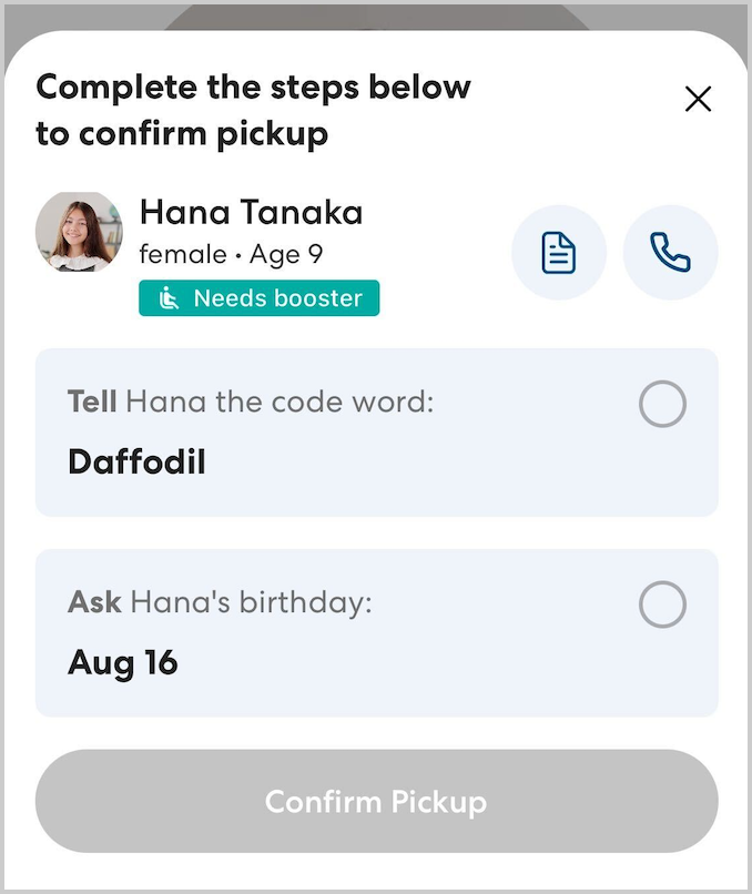 To further confirm, the CareDriver must then ask for the rider's birthday (month and day). The CareDriver only proceeds with the pickup if both the code word and birthday match.