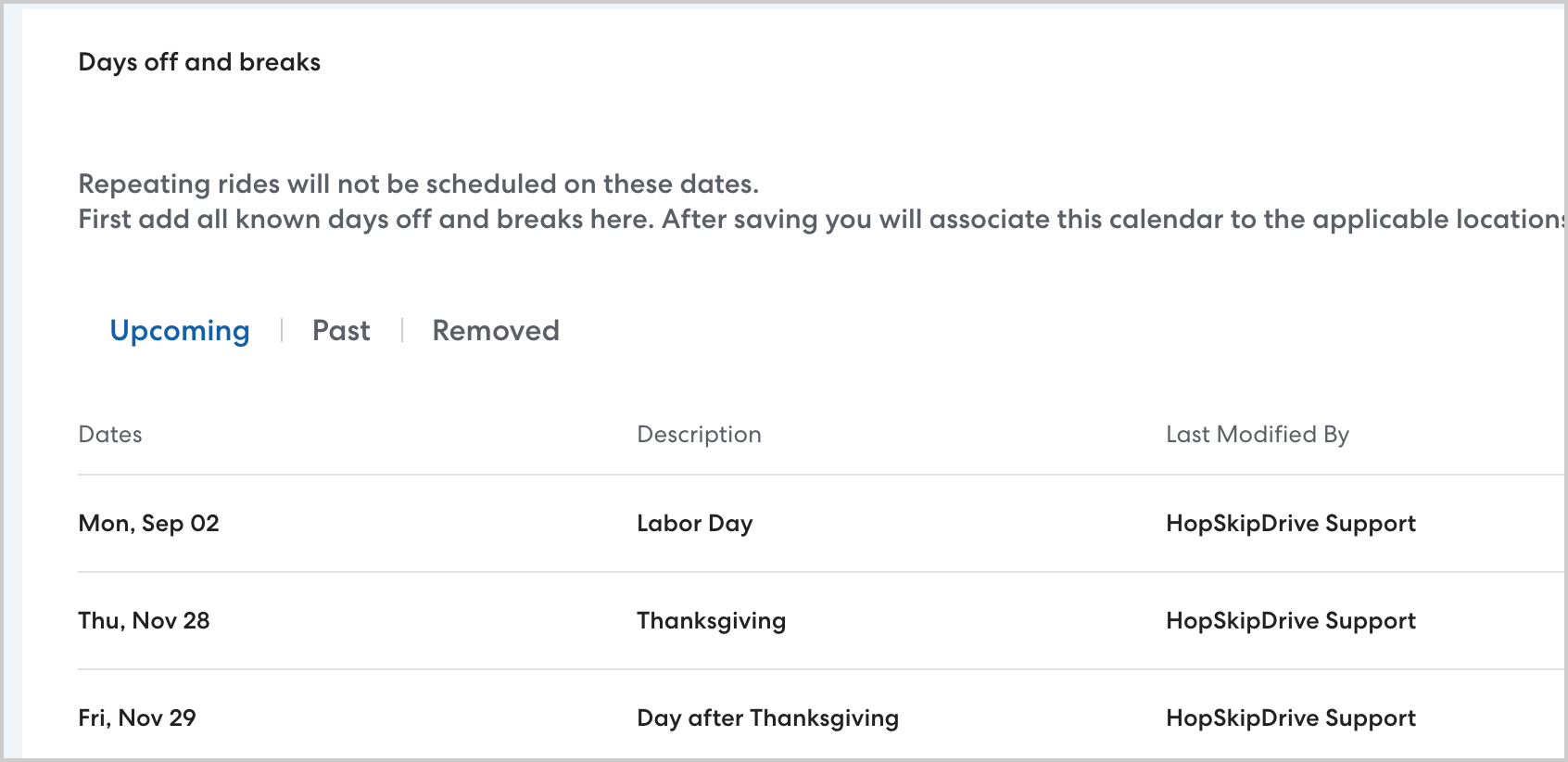 You'll see a list of default days off. These are days that HopSkipDrive is closed and no rides are offered. These days cannot be edited or deleted.