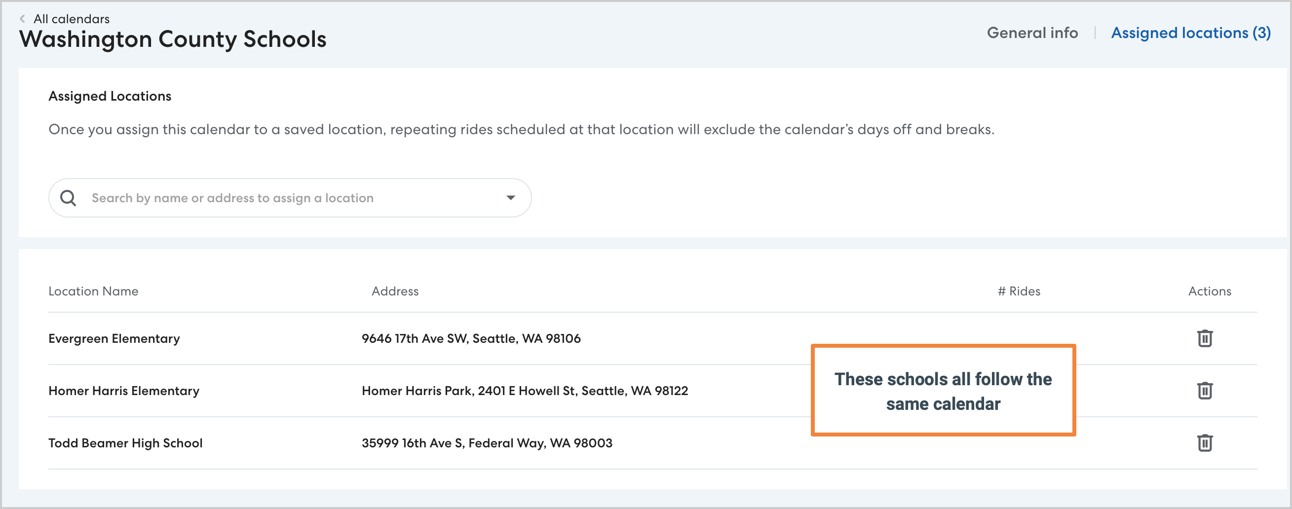 The district then begins scheduling rides to and from the three schools. When they add one of the schools as the pickup location for a pickup ride or the drop-off location for a drop-off ride, RideIQ automatically schedules rides only on days that school is in session, following the assigned calendar.
