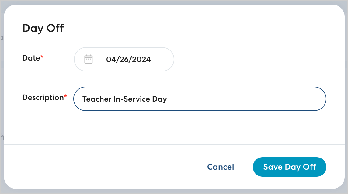 - Select the date(s) for the day off, then type a descriptive name. Click Save to confirm.