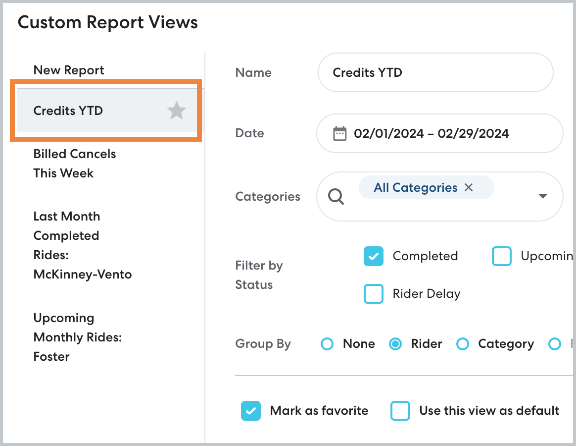 Favorites are specific to your account. Reports marked as favorite will appear at the top of the Custom Report Views list, marked with a star.