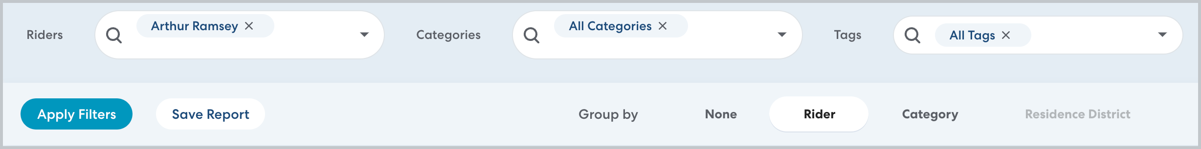 - In Riders, remove the All Riders filter, then type the name of the Rider you want to report on. If you'd like to report on multiple Riders, add all desired names, then, in Group by, select Rider.