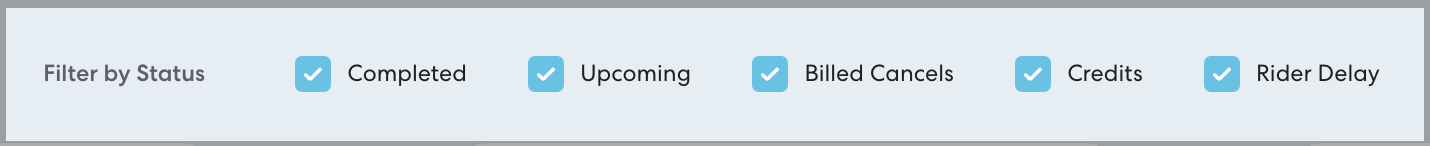 - In Filter by Status, select all ride statuses you want to see information for. Filters are cumulative, not restrictive. If you select multiple statuses, the report will include all rides that fit any of the selected statuses. You can select: