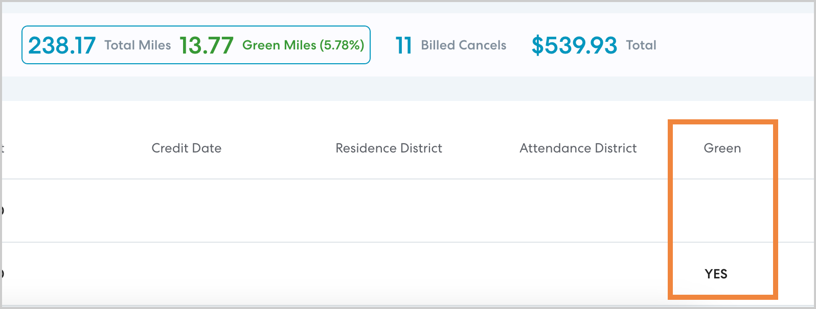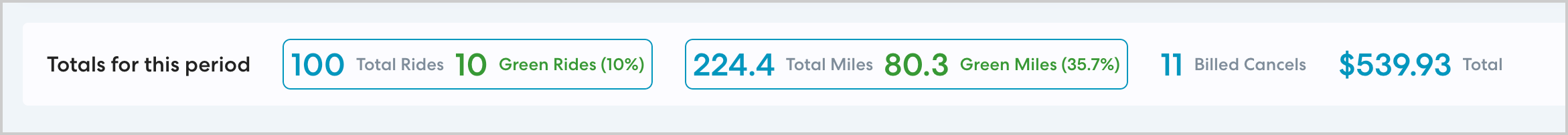The Green Rides totals at the top of any report indicate the number of rides and miles that were completed in a hybrid or electric vehicle. When reviewing these numbers, note that the overall totals (shown in blue) include billed cancels, if applicable. The totals shown for Green Rides include only completed rides.