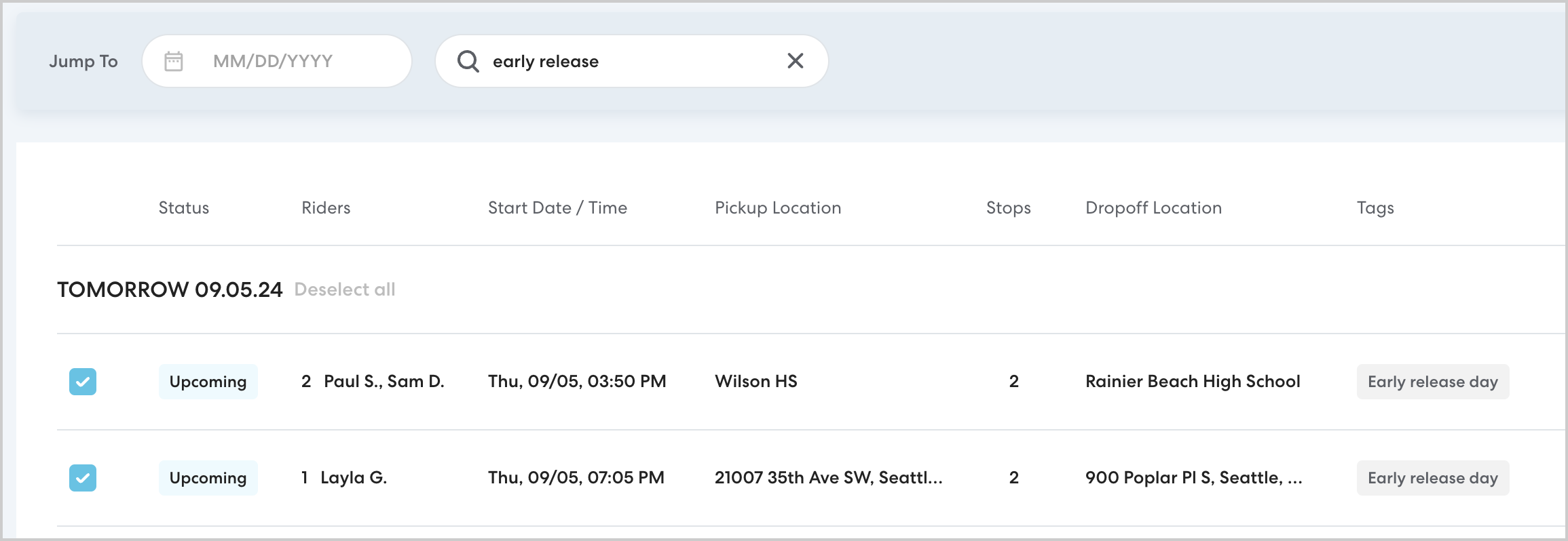 - Click the check box to select any rides you would like to cancel, or click Select all to select all rides on the selected date.