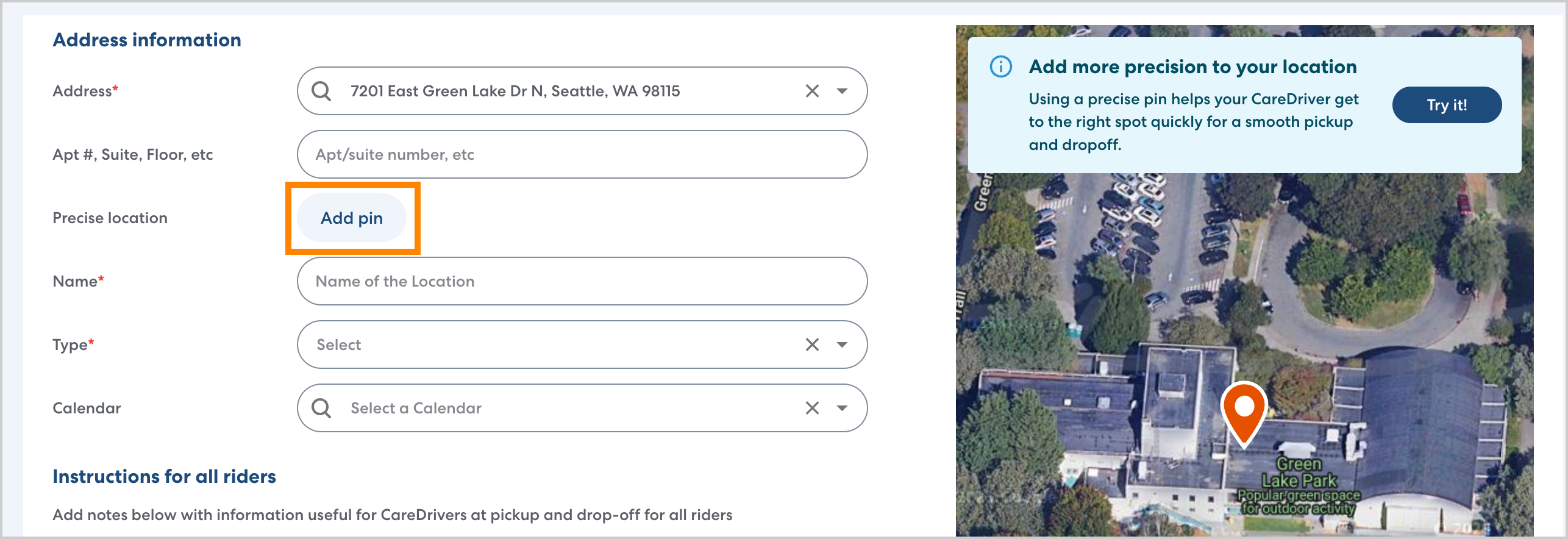 - In Instructions, add any information that will be useful for CareDrivers at pickup and drop-off. This could include: