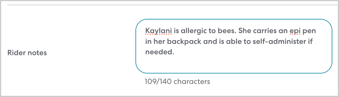 Rider notes: these notes are displayed to the CareDriver. Enter information that will help the CareDriver safely and successfully transport the rider. This could include allergies, required accommodations, or other details.