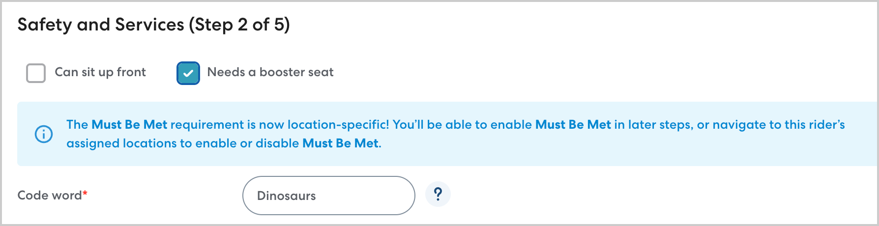 - If applicable, select one or more Rider Services. Rider Services are additional transportation services that can be added for an additional per-ride fee. Each service must be enabled at the account level before it can be added to a rider's profile. Learn more about Rider Services here.