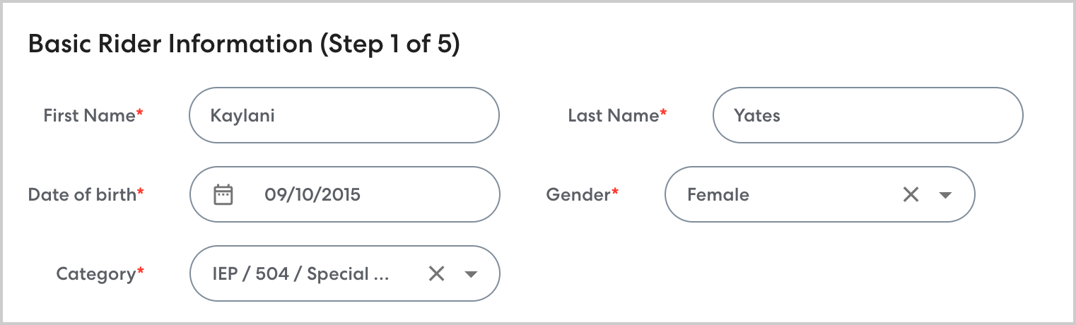 Enter information about the rider’s caregiver. This person will be the main point of contact for the rider and is generally their parent or guardian. After you save the rider profile, you can add additional caregivers or Emergency Contacts. Enter the following information: