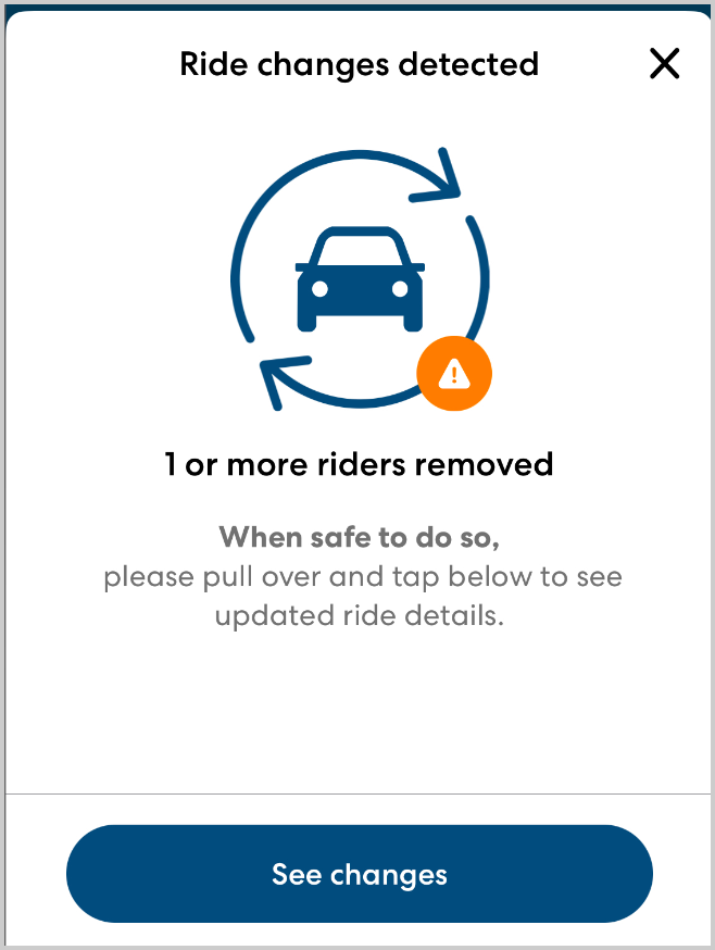 If a rider is removed once you have already started driving, you will see a notification in the app and in-app navigation will stop. When safe, pull over and tap See changes to reload the ride details page and re-start navigation on the updated route.