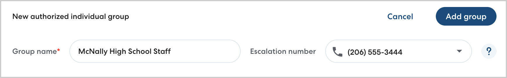 - Choose a clear, descriptive name for the group. In Escalation number, enter the phone number of someone who will be able to help resolve any issues with meeting the rider. This could be a member of staff on-site, a caregiver, or similar. CareDrivers will use this phone number if they are not able to find the Authorized Individual at drop-off.
