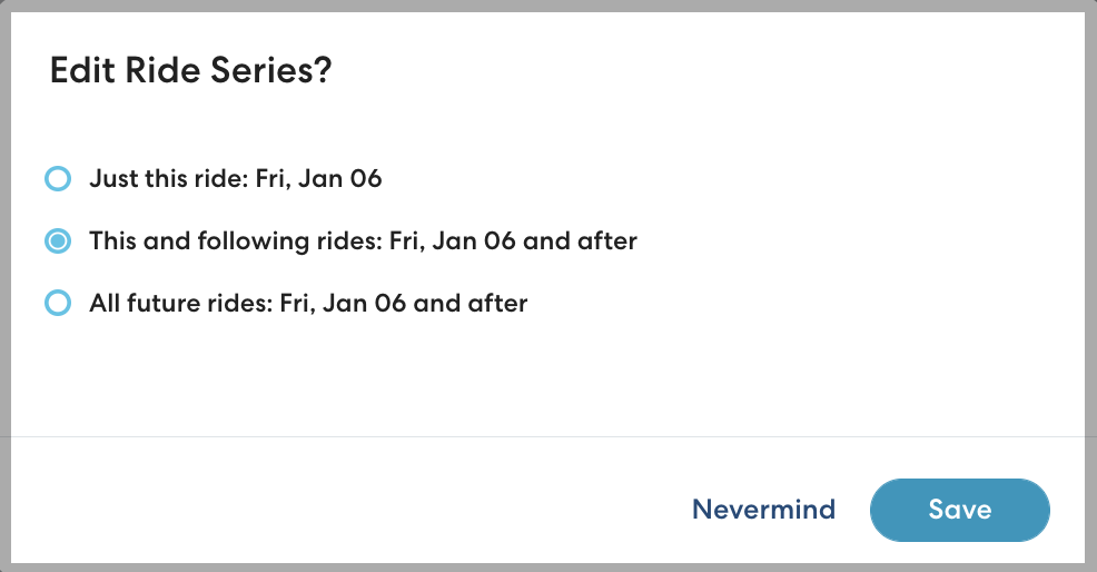 - Click Save to confirm your changes. If you are editing a ride series, select which rides to apply your changes to.