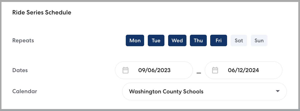 - Select the days of the week when rides should take place. Set a start date and end date for the new Ride Series. You can set up Ride Series at any time, but be sure to set the start date for the start of the school year or whenever the Rider will first need rides.