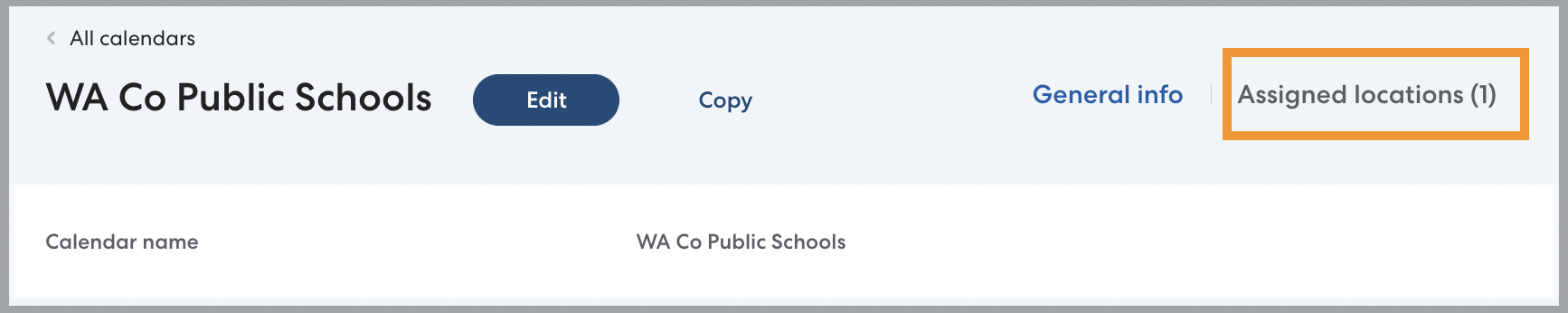 To view and manage which Locations a specific Calendar is assigned to, select the desired Calendar on the Calendars page, then click Assigned Locations.
