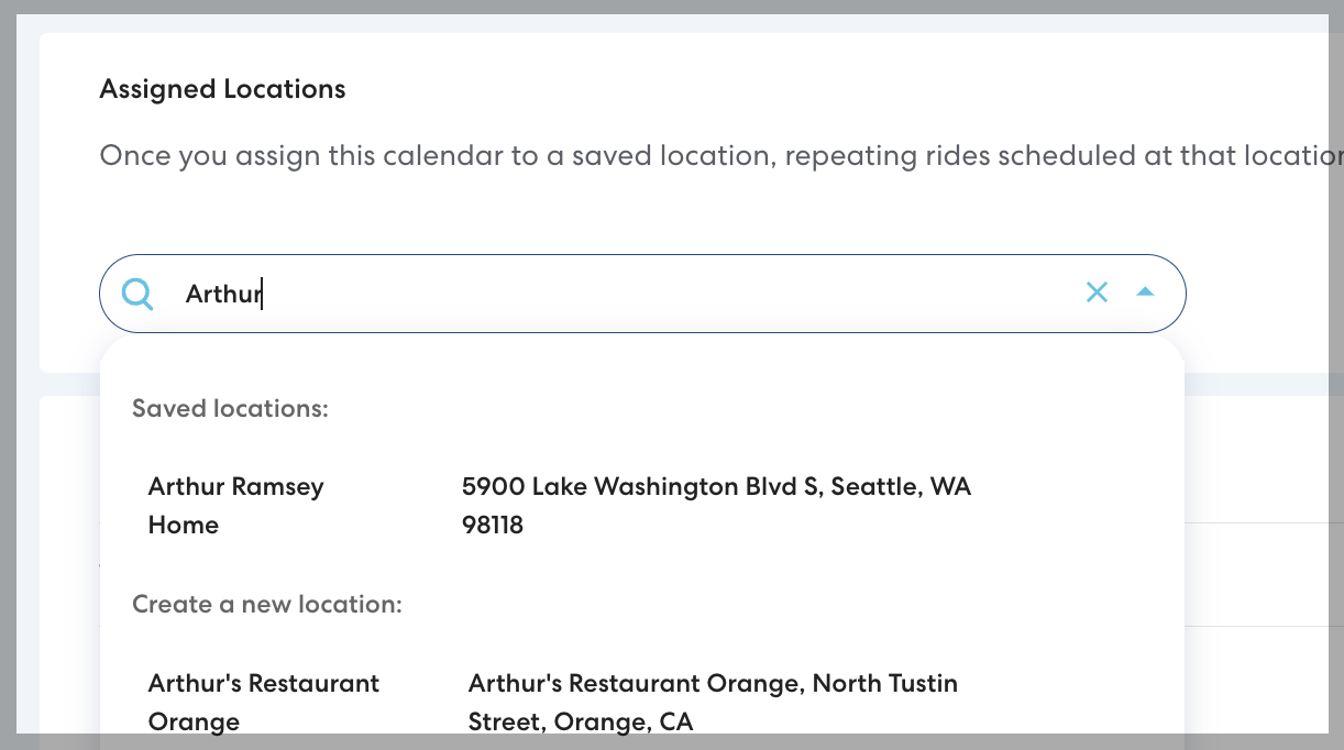 To assign the Calendar to an additional Location, begin typing a Location name or address in the search field, then select the desired Location from the list. Choose from saved Locations, or create a new Location if necessary.