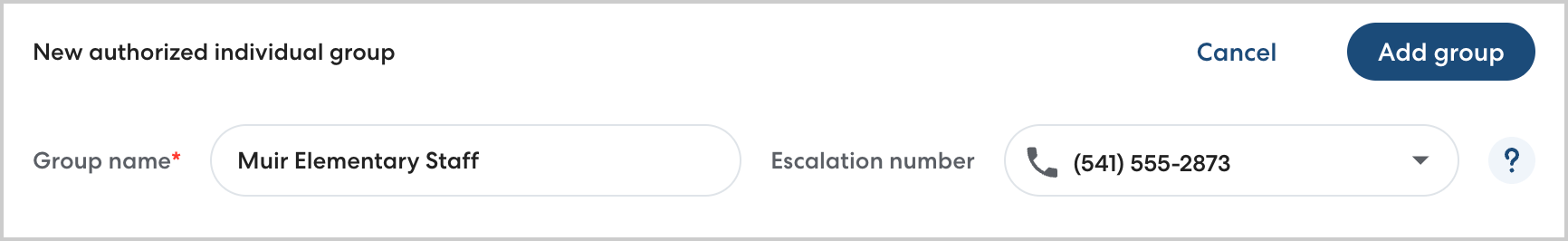 - Enter the appropriate escalation phone number for the group. Choose a number that will consistently be available if the CareDriver has trouble locating an Authorized Individual.