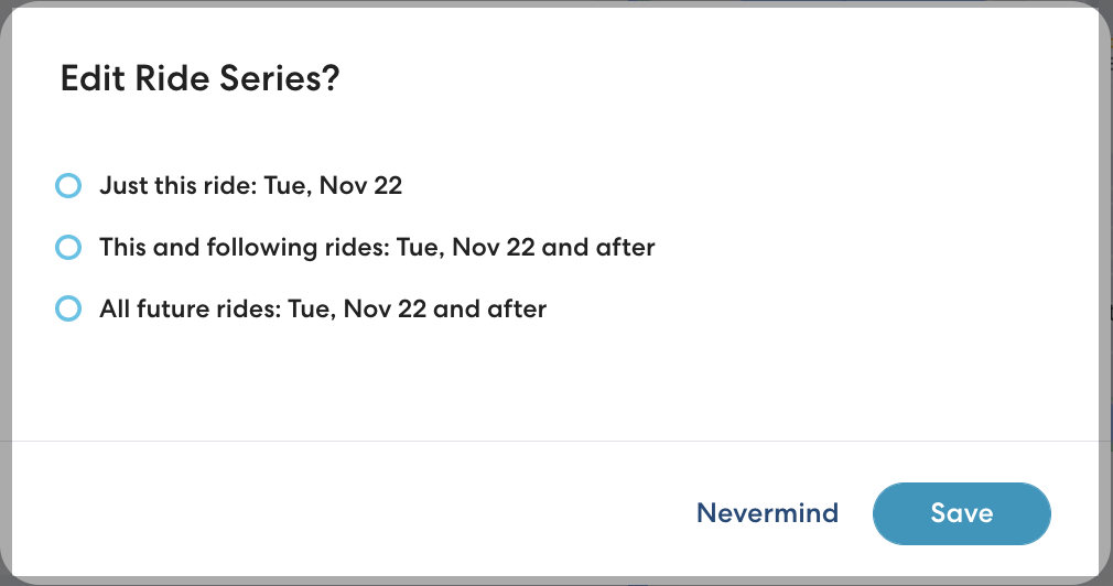 - Repeat as needed for any additional riders and locations, then click Save. If you are making changes to a Ride Series, select whether to apply changes to all rides in the series, all rides after the selected ride, or just the selected ride, then click Save.