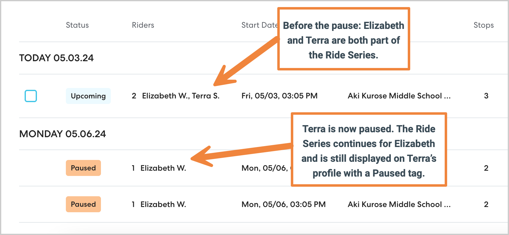 Pausing a rider allows you to temporarily stop HopSkipDrive transportation for a rider, then resume transportation as before without needing to rebuild their Ride Series.