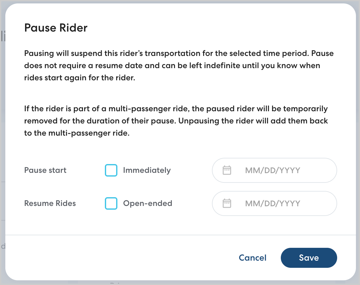 When you are ready to resume transportation for the rider, you can unpause them. The rider's previously scheduled ride series will then be resumed as before, with no additional scheduling required.