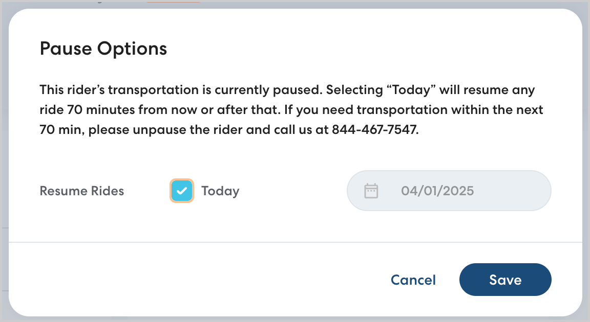 - Select Today to resume transportation immediately. If you select Today, any rides starting at least 70 minutes from the time you unpause the rider will resume. To unpause the rider on a future date, enter the desired date.
