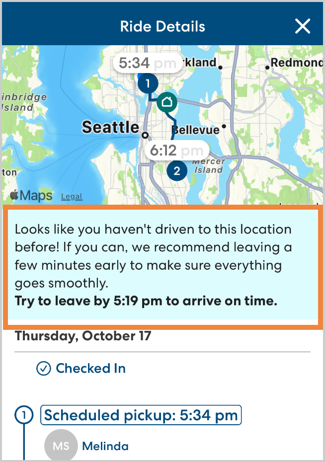 All the details of picking up or dropping off a rider at a place you haven't been before can be complex. Sometimes it takes a little extra time to navigate pickup procedures or find addresses you're not familiar with. To continue to support CareDrivers in arriving on time, we suggest leaving a few minutes early when you're driving to a location you haven't been before. With this update, you'll see a message in the CareDriver app letting you know when you're driving to a location you may be unfamiliar with and suggesting that you leave a little earlier.