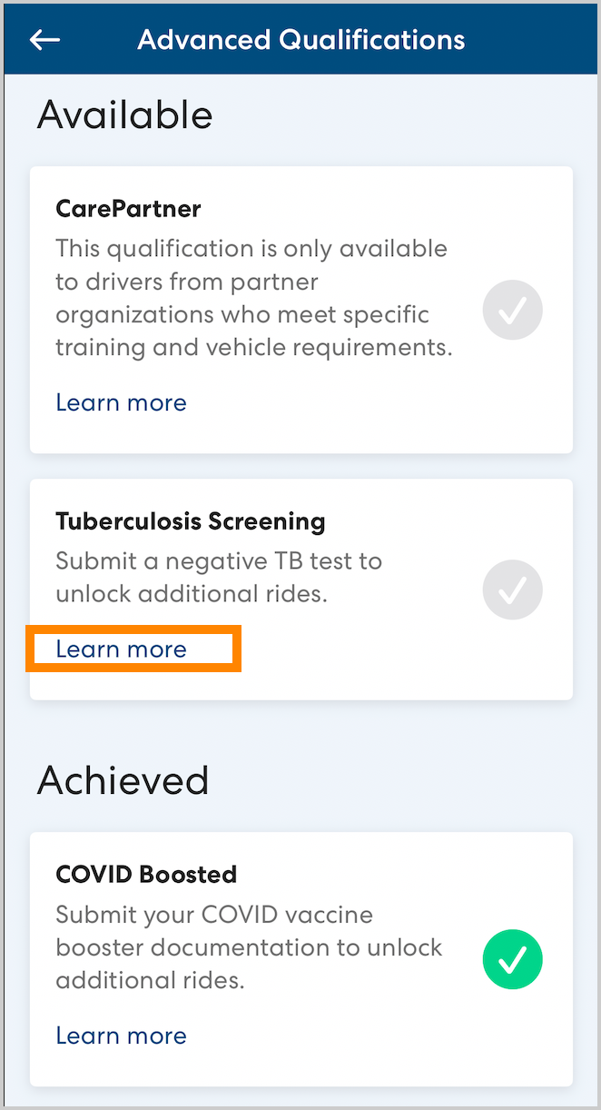 With this update, we've made it easier to see all Advanced Qualifications available for CareDrivers in your area so you can easily select the Advanced Qualifications that are the best fit for you. Review the Advanced Qualifications you've already claimed and see the requirements for obtaining additional Advanced Qualifications in the Advanced Qualifications section of your profile.