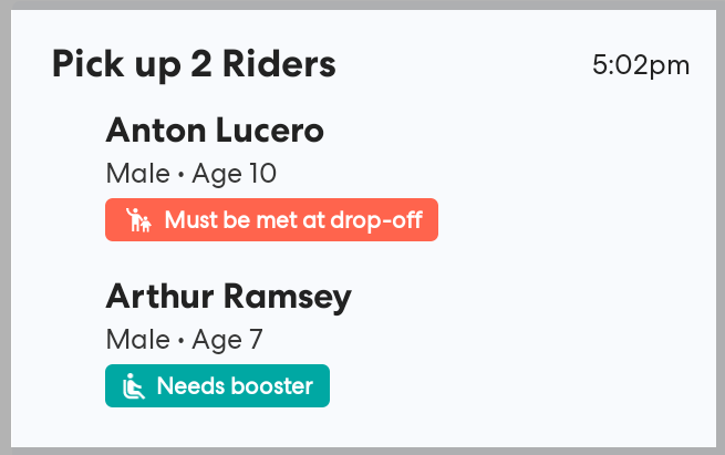 Rider Notes and Location instructions are a vital part of smooth, safe pickups and drop-offs. With this release we've made them more prominent at each stage of the process, including highlighting important safety information with the Must Be Met at Drop-Off tag and Booster Seat tag in more eye-catching colors.