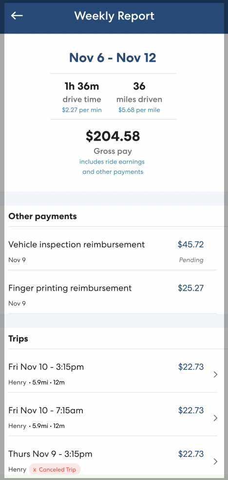 You'll also see more detail on the Trip History page. Tap to see your total earnings for a week broken down by ride, including additional payments like promotions and toll reimbursements. Tap a specific ride to see trip details, including miles and minutes driven.