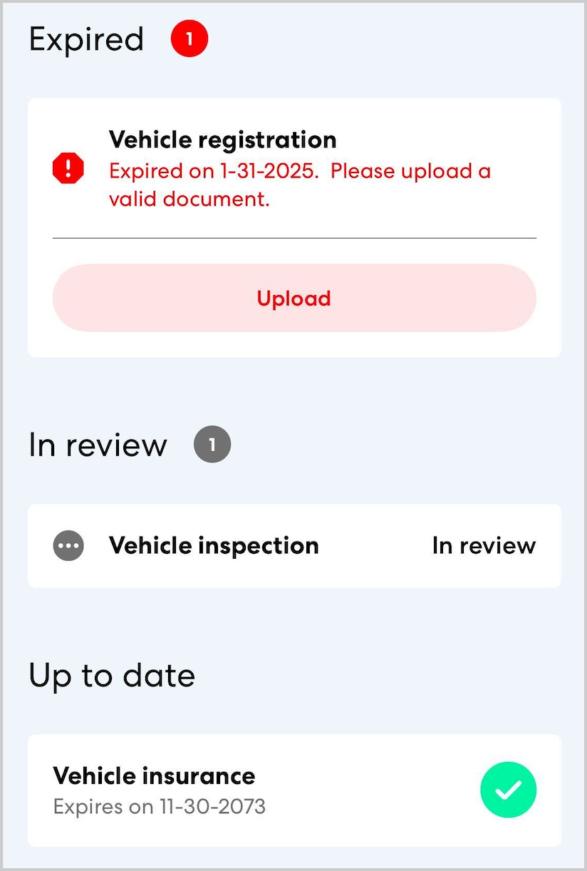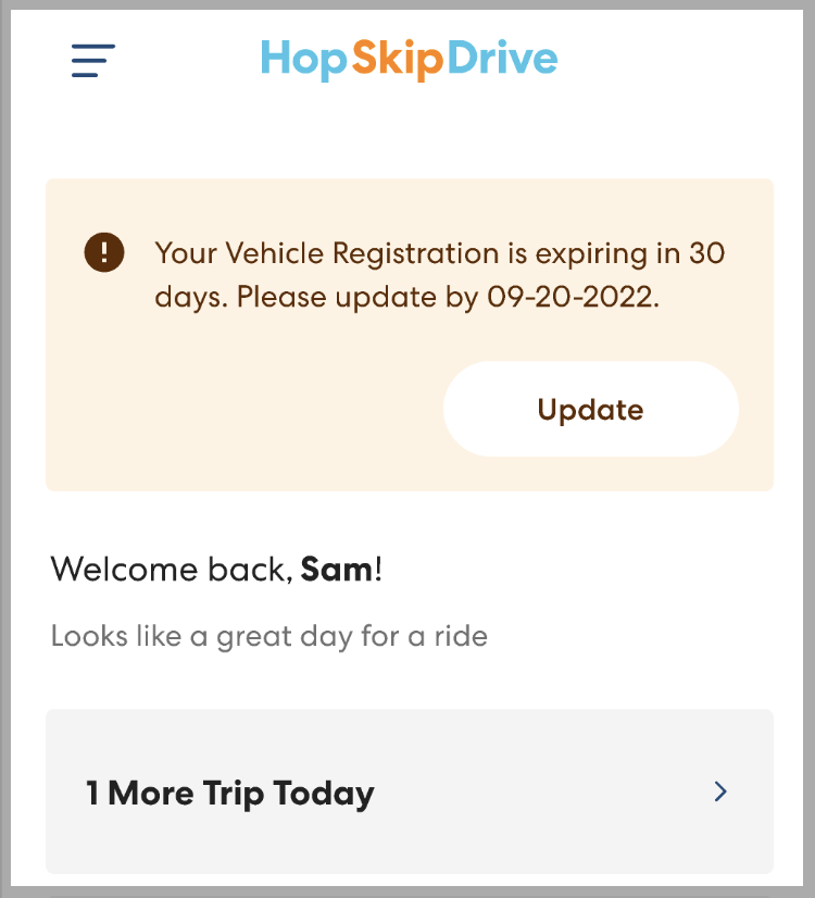 Keeping all required documents up to date is key to maintaining your status as a certified CareDriver. With this release, you'll see a warning in the app when key documents will be expiring soon, giving you time to take any necessary steps.