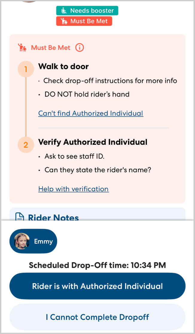 With this release, we've made the process of dropping off a rider with a Must Be Met requirement clearer and given you more options to get help if you need it. With this change, the Must Be Met requirement is now set at the location level, so you will need to find an Authorized Individual at locations where it is truly needed. To avoid uncertainty about how and where to meet an adult, we've introduced three Must Be Met protocols, which are clearly outlined in the app. In addition, we've added new verification requirements to ensure that riders are dropped off safely. Finally, we've added additional escalation numbers to make sure you're able to contact someone who can help in the event you do have trouble locating an Authorized Individual.