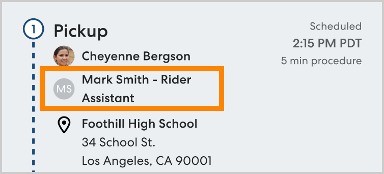 - Once the Rider Assistant is assigned, you'll see their name and phone number displayed under Rider Assistant and on the relevant waypoints in the ride timeline.