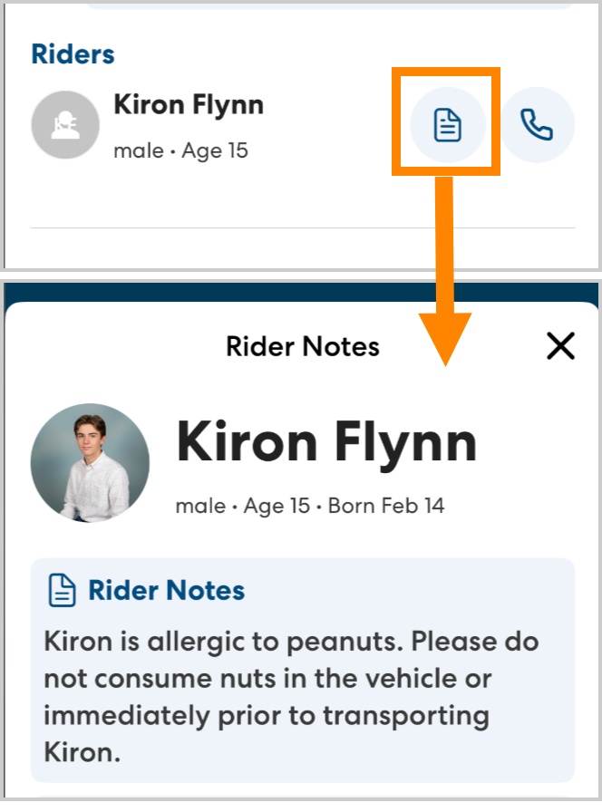 To see more information about the riders you will be transporting, scroll to the bottom of the page. Tap the notes icon to see rider notes. Rider notes include information about the rider that may be relevant during the ride. These notes are also visible once you begin the ride.