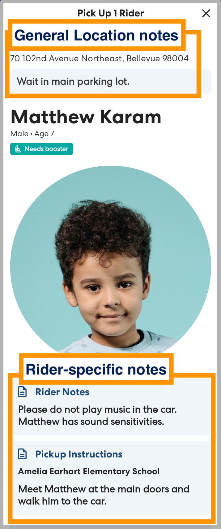 - Carefully read and follow any instructions and notes. The location and rider notes will help you understand where to meet the rider and any special needs they may have.